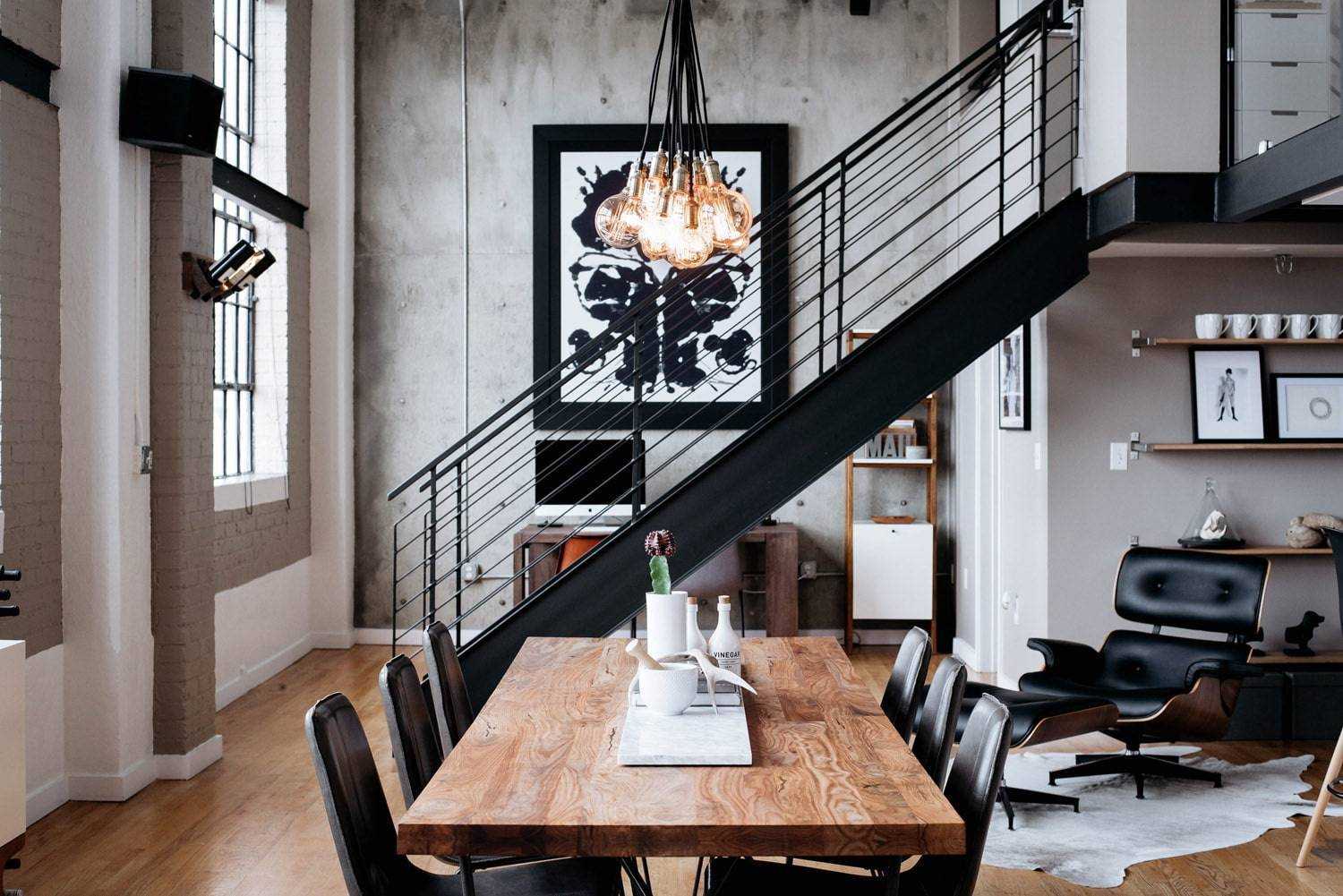 Цветовая палитра состоит из нейтральных серых, коричневых или черных оттенков. В интерьере возможны яркие акценты в обивке, текстиле или декоративных предметах. Благодаря непринужденному и свободному расположению меблировки, помещение выглядит более живо и просторно. Лофт может гармонично сочетать предметы в самой разнообразной стилистике, например это могут быть старинные кресла, хромированные стулья, диван с кожаной или текстильной обивкой.