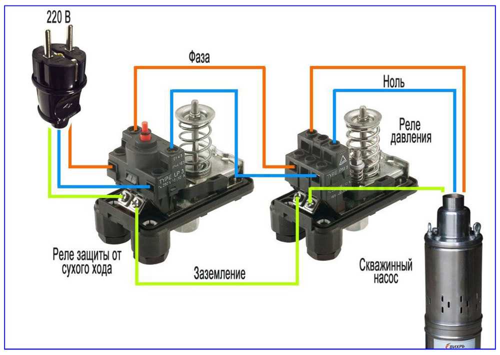 Рис. 2 Конструкция реле давления и сухого хода, схема их подключения