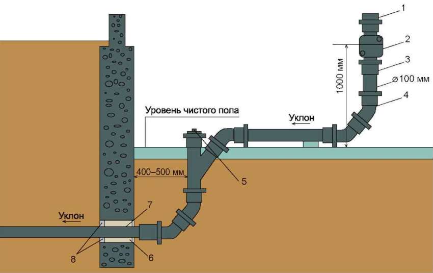 Схема выпуска канализационного стояка: 1 — стояк, 2 — ревизия, 3 — крепление стальным крючком под раструб, 4 — отвод пол углом 135°, 5 — пробка прочистки, 6 — стальная гильза, 7 — забивка смоляного каната, 8 — цементный раствор