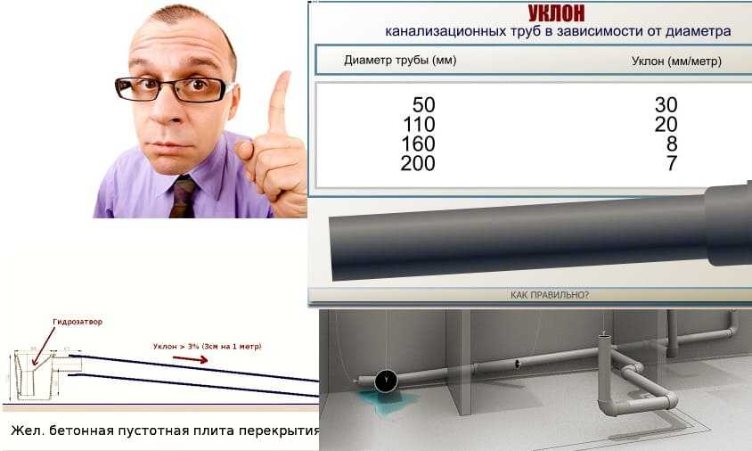 Канализационный гидрозатвор – в нем всегда остается вода Все части трубопровода должны идти прямо, не уменьшая угол наклона труб. Для этого делают разметку красящими нитями. Некоторые компании рекомендуют делать угол наклона до 15 см для труб диаметром 50 см и меньше. По описанным выше причинам поступать так не стоит.
