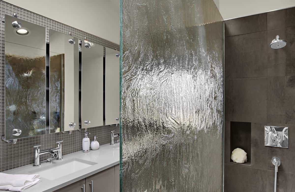 - в оформлении ванной комнаты — вы можете сделать двери душевой кабины из рельефного стекла.