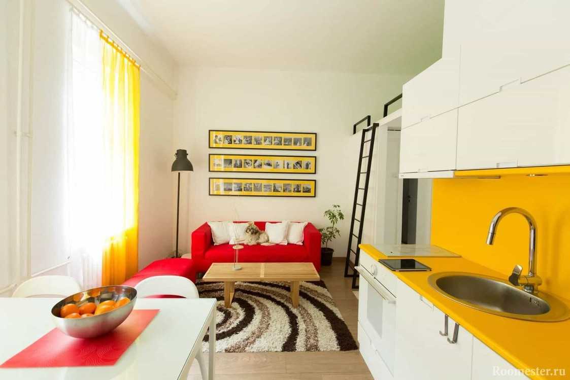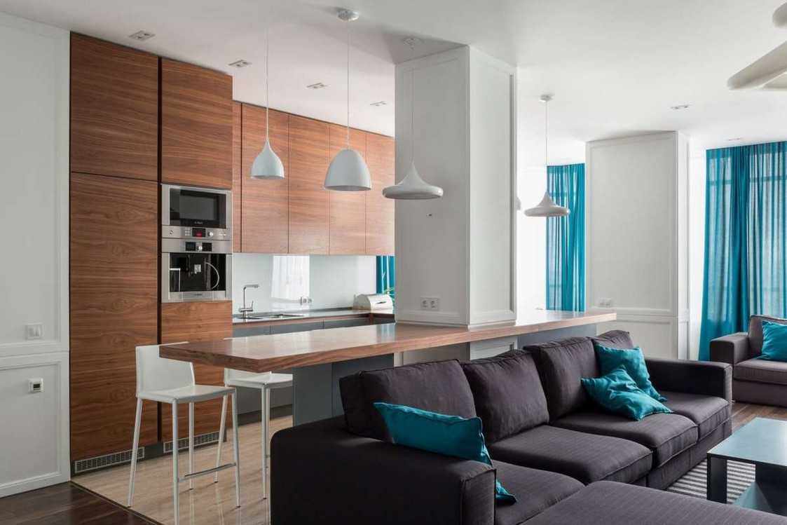 | Кухня, соединенная с гостиной | Если кухня соединена с гостиной — в квартире студии или при снесении стены между ней и комнатой, под зону готовки и принятия пищи можно отделить небольшое пространство. |