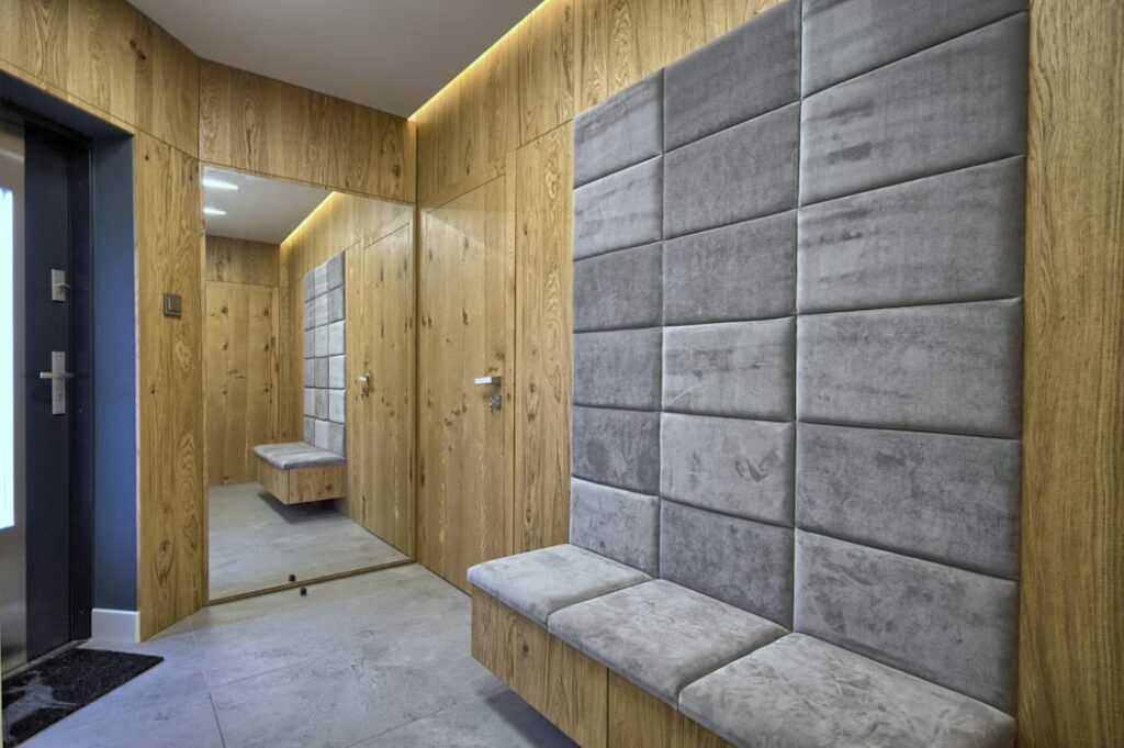- Декоративные панели делают из разных материалов, но для прихожей лучше брать практичные. Ламинированный пластик отлично моется, он может быть с любым декором. Объемной отделки лучше избегать или облицевать только 1 стену.