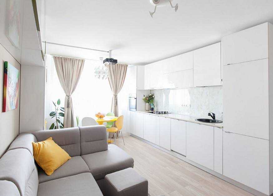 - Можно совместить несколько пространств в одну площадь, например, балкон и комнату или комнату и кухню. Только следует помнить, что любая перепланировка должна быть законной.