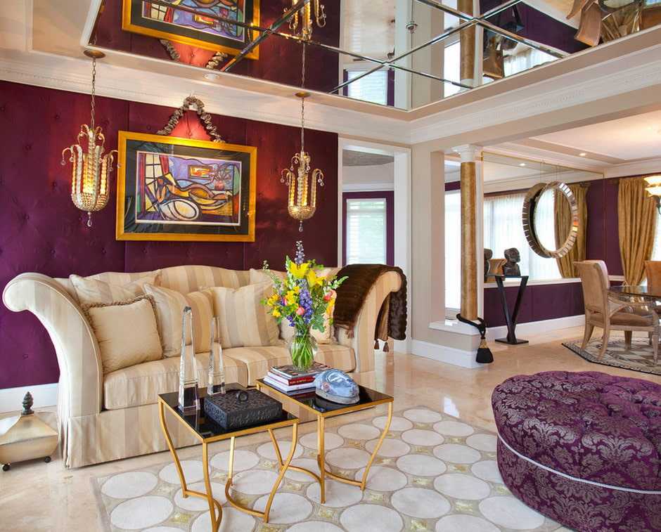 Зеркальный потолок – это отличный способ сделать акцент на одной или нескольких зонах гостиной. Установив зеркало над чайным столиком или над камином, можно создать интересный эффект. Особенно, если подчеркнуть этот дизайн светильниками.