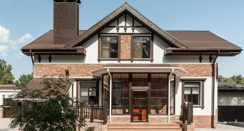 - Форма крыши проектируется так, чтобы со стороны фасада тоже был фронтон с окном. Эта часть строения акцентирующая, и для её отделки часто используют элементы классической архитектуры.