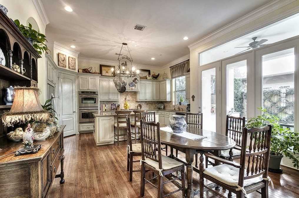 Этот французский стиль в интерьере кухни предполагает наличие большого обеденного стола, нескольких маленьких шкафчиков и открытых полок, заставленных фарфоровой посудой и симпатичными безделушками.