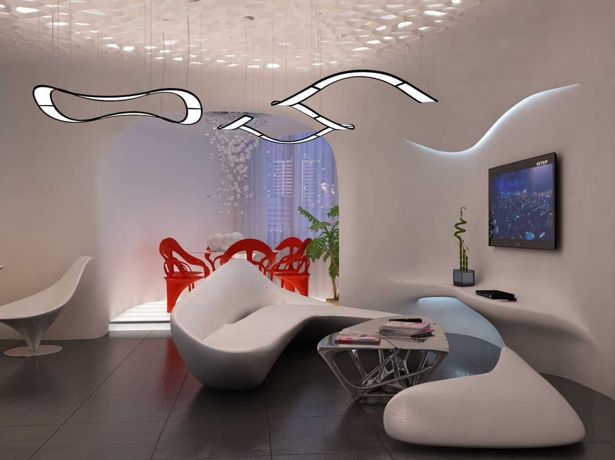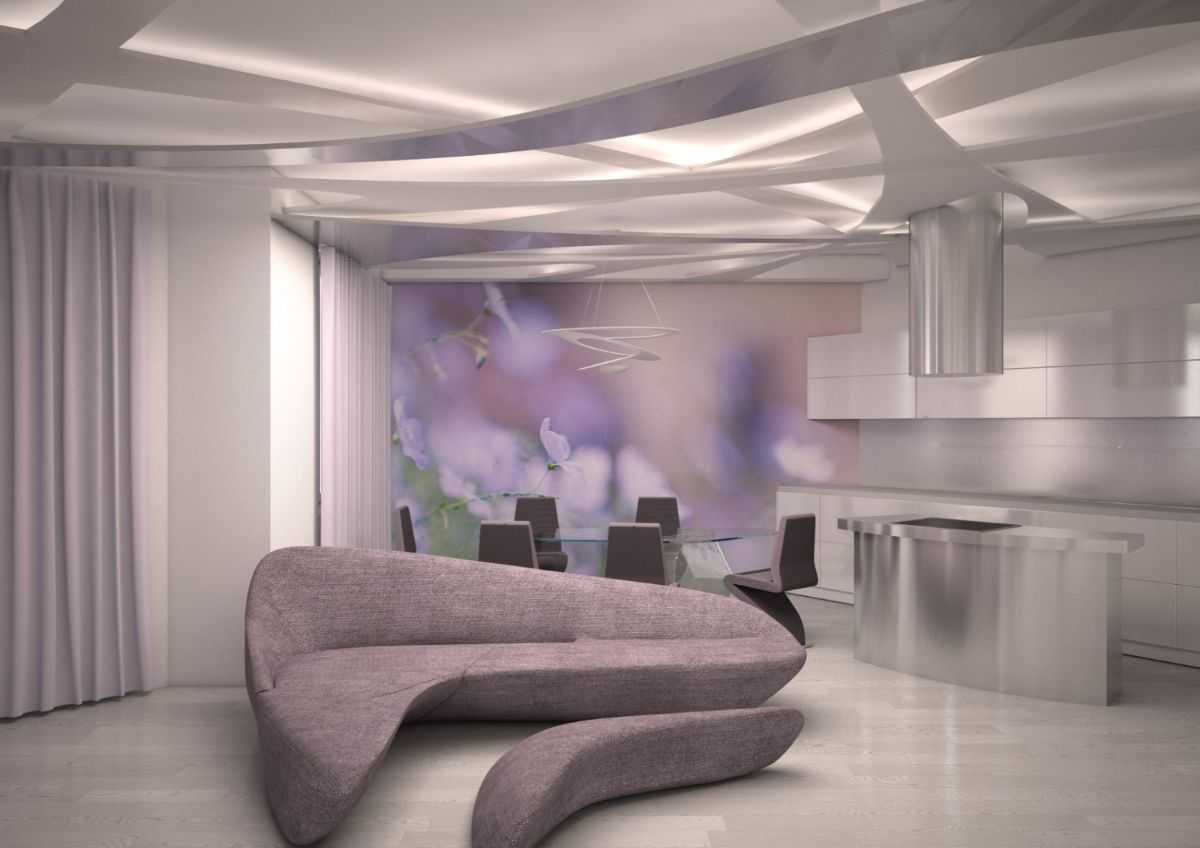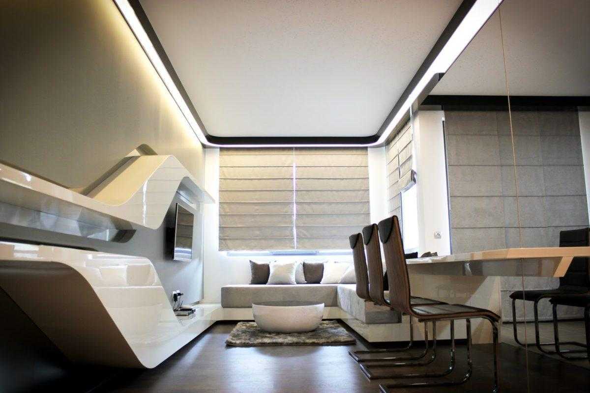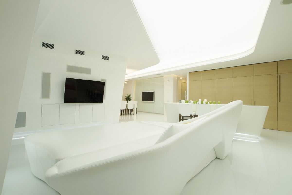 - Потолок. Стандартный белый подходит для всех направлений, в том числе футуристического стиля в интерьере.