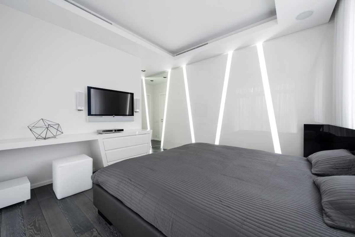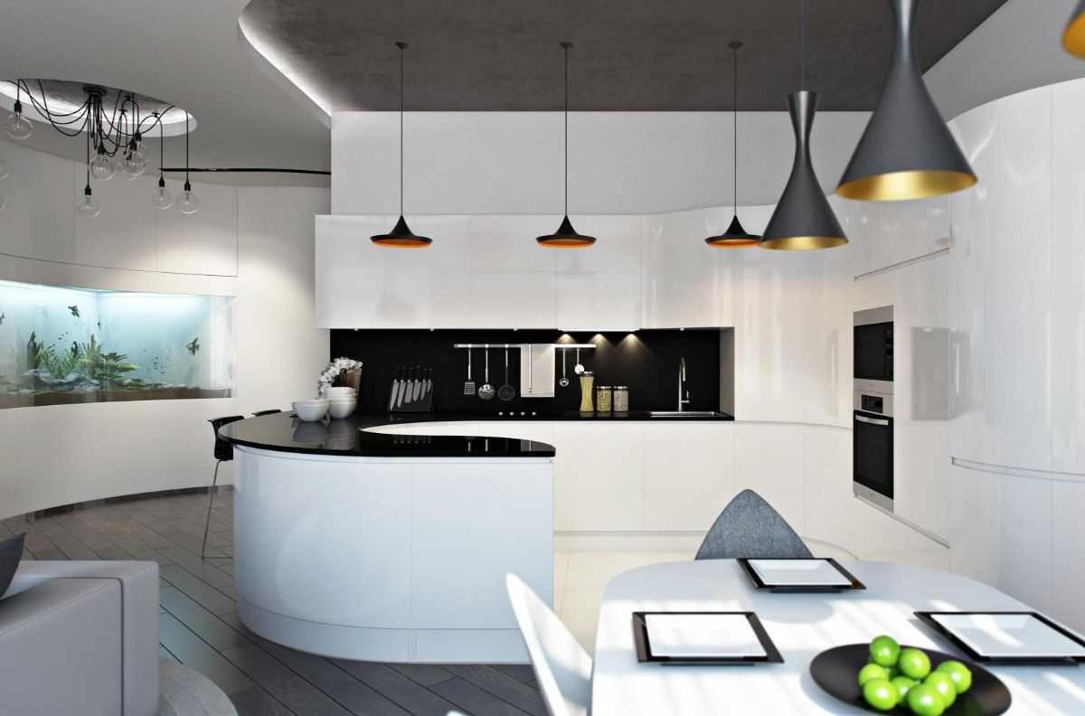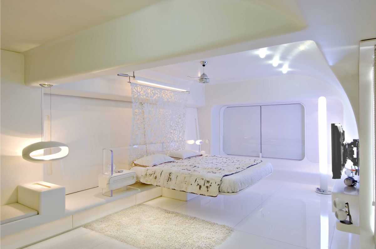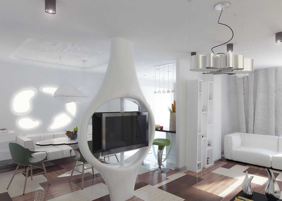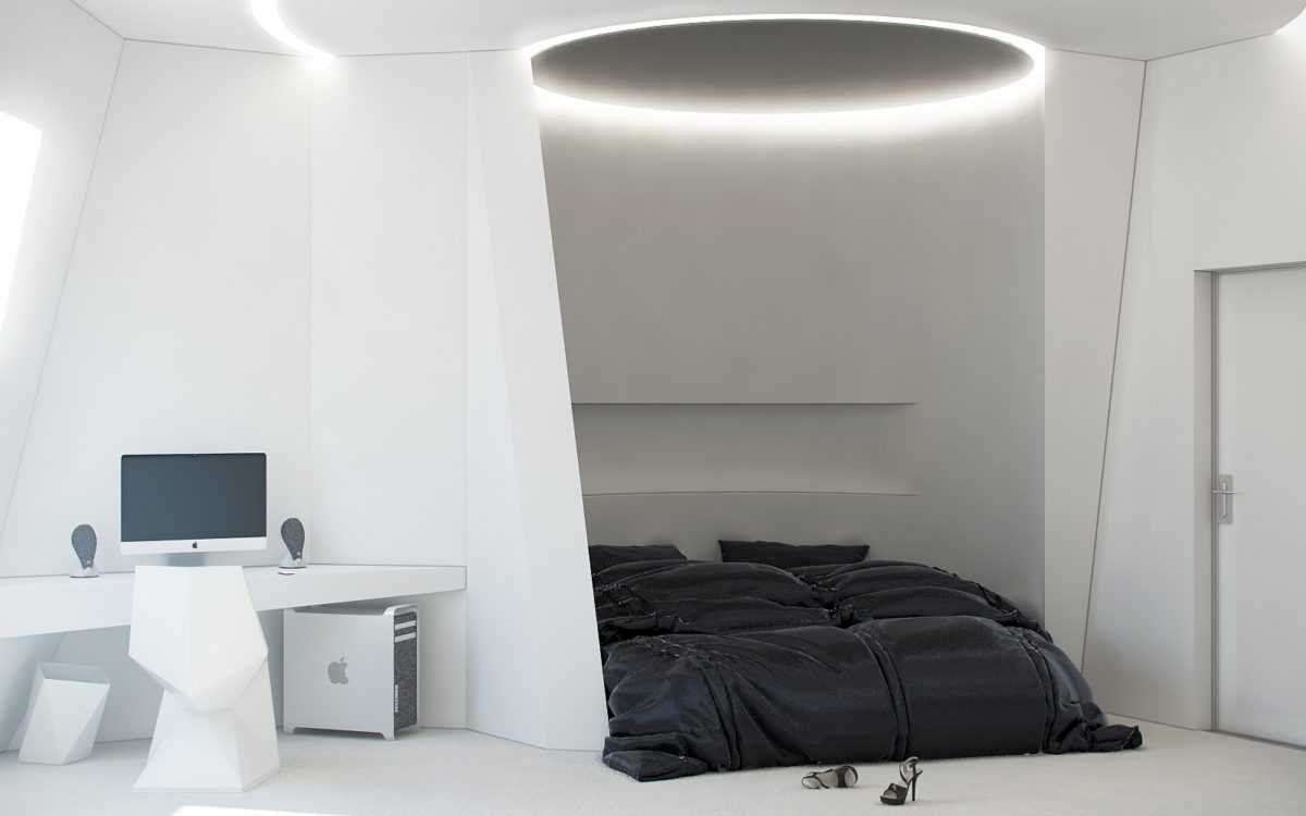 - Потолок. Стандартный белый подходит для всех направлений, в том числе футуристического стиля в интерьере.