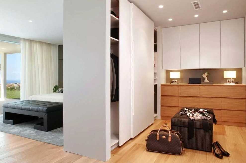 Гардеробная, находящаяся в центре однокомнатной квартиры-распашонки может разделять кухню и гостиную. Со стороны кухни в стене комнаты могут быть ниши для хранения мелких и крупных деталей, а также посуды.