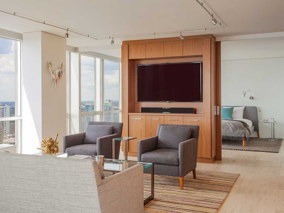 Организуйте функциональное и практичное место для установки телевизора. Это не должна быть классическая тумба, которая занимает много пространства. Лучше повесить плазму на стену или вмонтировать внутрь, установить среди полок или стеллажей.