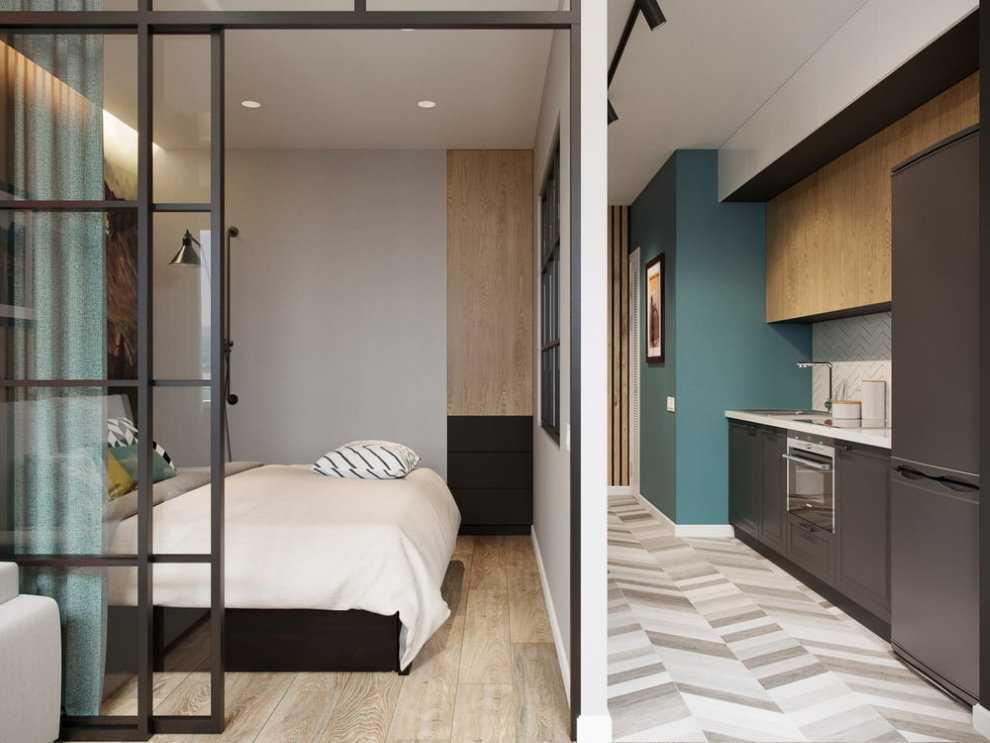Из однокомнатной квартиры может получиться двухкомнатная. Для разделения комнат можно установить распашную или раздвижную дверь. Это будет выглядеть необычно, но и придаст интерьеру особенный вид. Этим можно сэкономить квадрат площади.