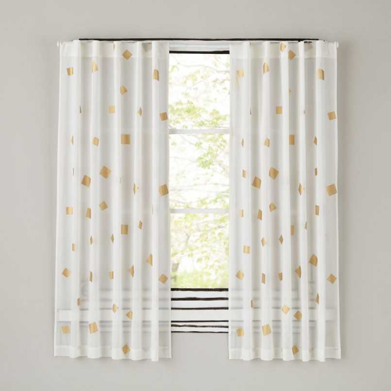 Если интерьер помещения задуман в смелом, ультрасовременном стиле: переливающиеся обои, металлические детали в мебели – тогда можно подобрать шторы с блестящими вставками или узорами цвета металла. Рисунки из разных геометрических фигур хорошо подходят к обоям в таком же стиле.