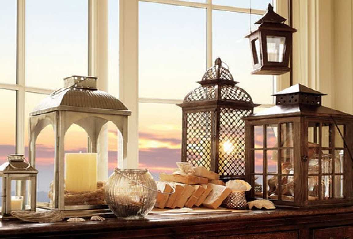 Для составления композиции подойдут сувениры из путешествий, подарки от близких людей, настольные лампы, декоративные птичьи клетки, фонари.