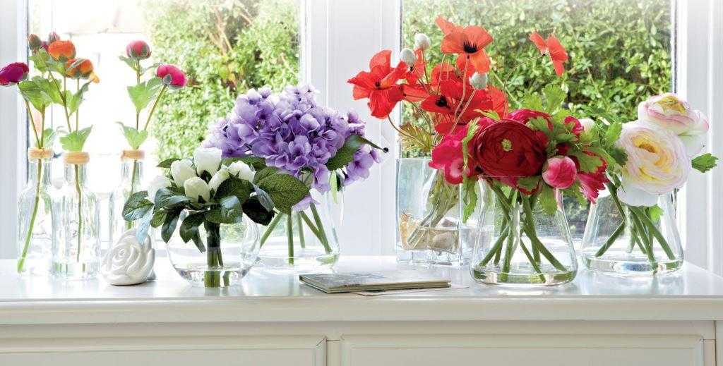 Необычайно ярко выглядят свежесрезанные цветы в одинаковых прозрачных сосудах или цветных бутылках. Впрочем, коллекция из бутылок или вазочек цветного стекла одной или схожих форм украсит любой подоконник и без живых цветов.