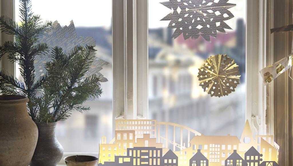 В продаже есть множество светодиодных гирлянд и игрушек: звезд, ангелов, снежинок, оленей, снеговиков, другого праздничного декора. Окно можно расписать специальными красками, изобразив на нем морозные узоры, тематические картинки, подсветить светодиодами или свечами, и ваш дом будет светиться по вечерам, словно сказочная шкатулка. Подсвечники можно приобрести или смастерить своими руками из прозрачных или жестяных банок, зажечь свечи, светодиодные фонарики. Попробуйте украсить окна вырезанными из бумаги и картона силуэтами, – заснеженными городами с подсветкой из тех же гирлянд. Очаровательно смотрятся самодельные гирлянды из ангелочков, снежинок, звезд из белой, цветной бумаги, фольги, — словом, смастерить можно все, что угодно, на что у вас хватит времени и фантазии.