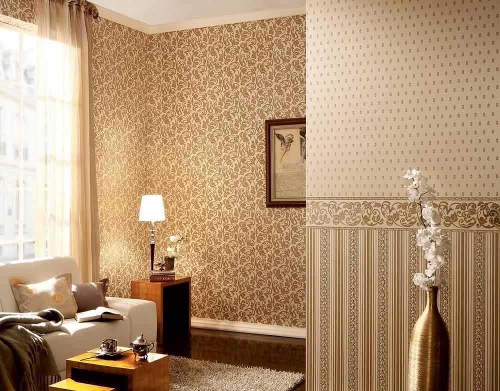 Если зал прямоугольный, визуально расширить площадь можно при горизонтальном сочетании орнамента. Вертикальное комбинирование позволяет «вытянуть» гостиную с низким потолком.