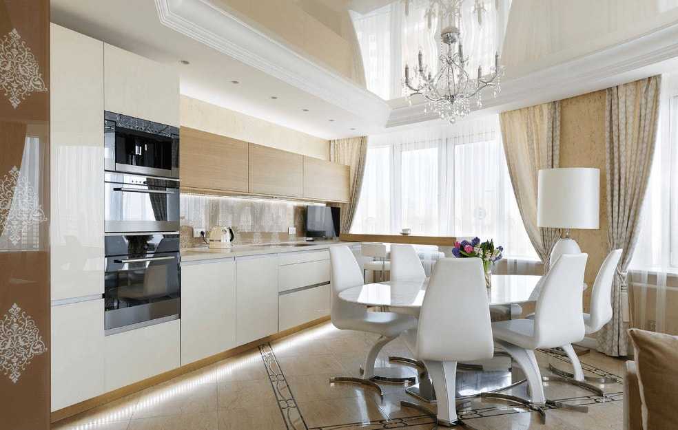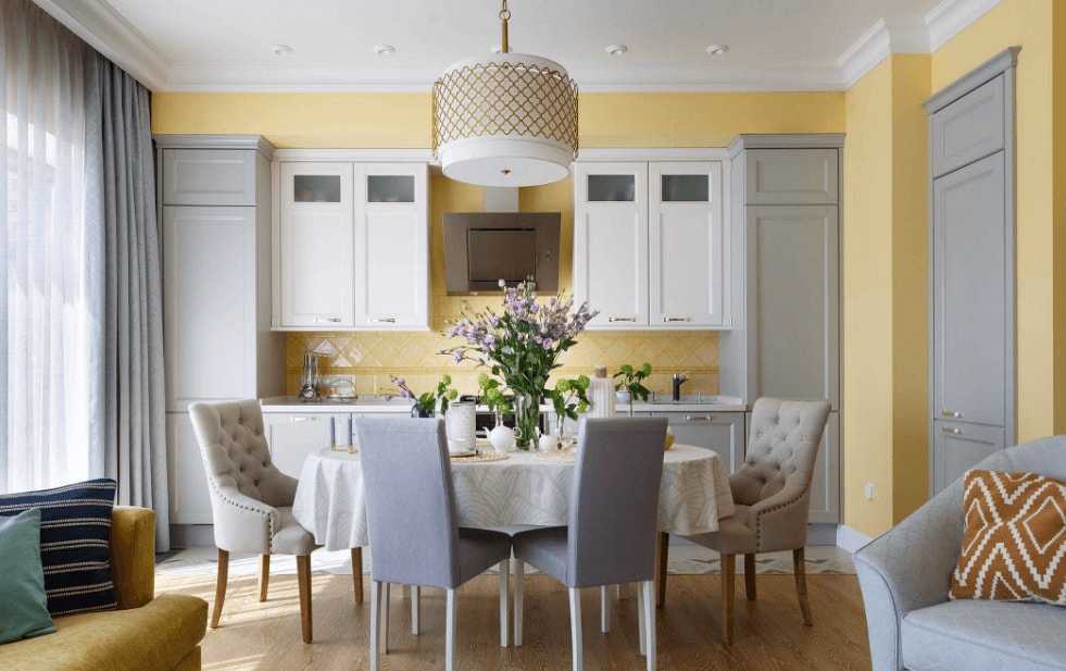 Большая кухня-студия позволяет использовать тяжелые шторы «в пол»