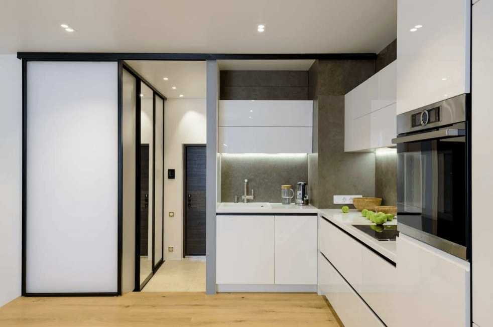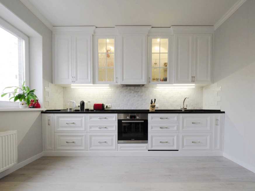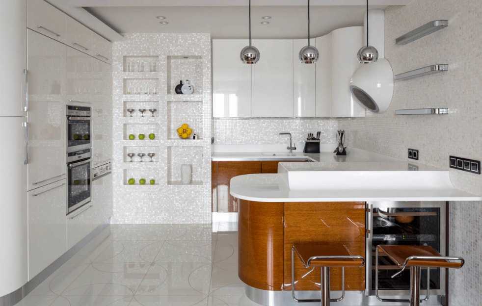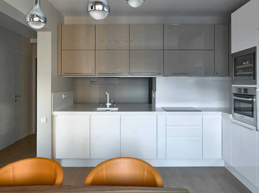 Также для визуальной коррекции пространства подходят зеркальные и глянцевые поверхности. Отличным решением в такой ситуации будут панорамные окна, за счет чего на кухне всегда будет больше света. Ну и конечно же, не стоит забывать об искусственном освещении. С его помощью можно выгодно расставить акценты и подсветить рабочую поверхность.