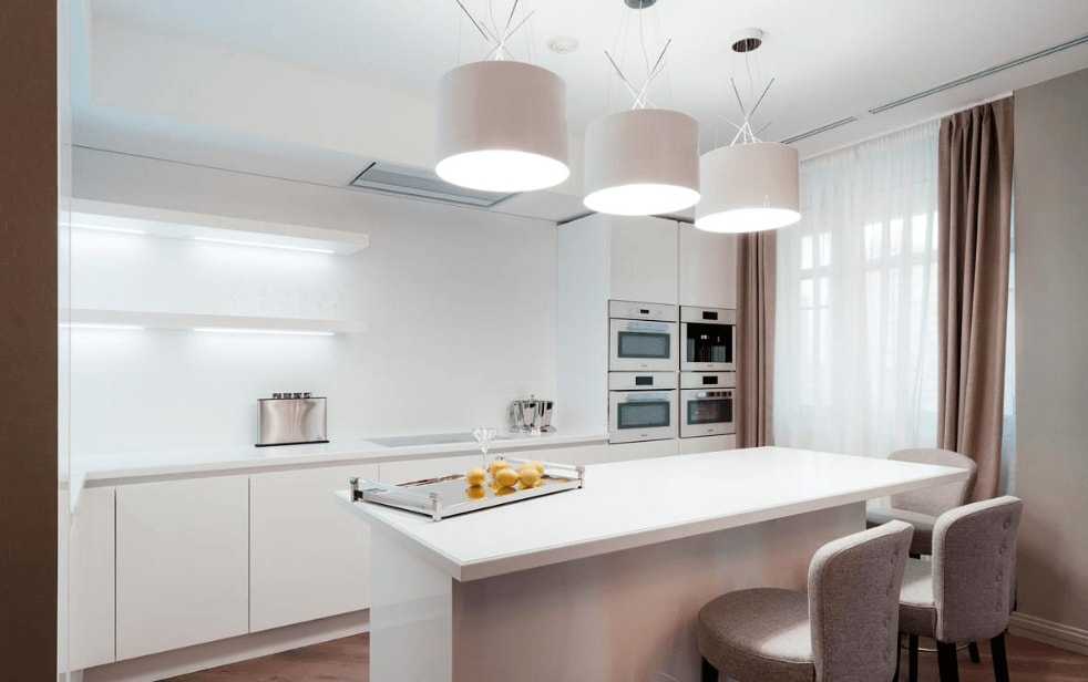 - Акцент на роскошных люстрах. Остров сам по себе является центральным элементом дизайна, а шикарные удлинённые люстры, подвешенные над ним, только усилят этот акцент. Расположив их на определённой высоте, удаётся зрительно зонировать помещение на рабочее и столовое пространство.