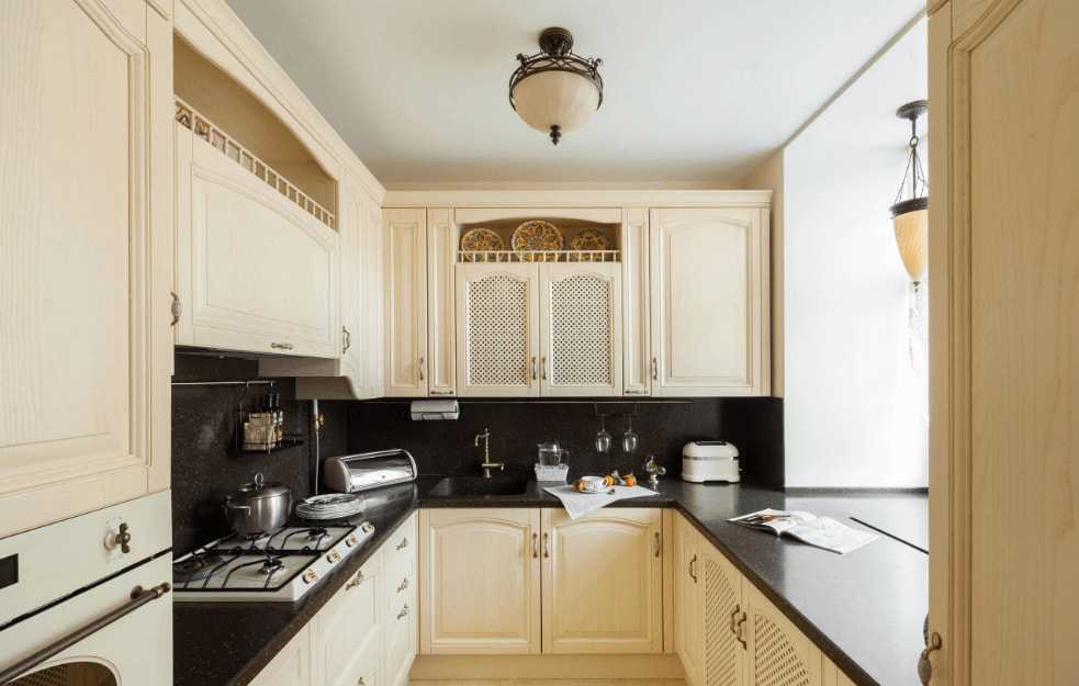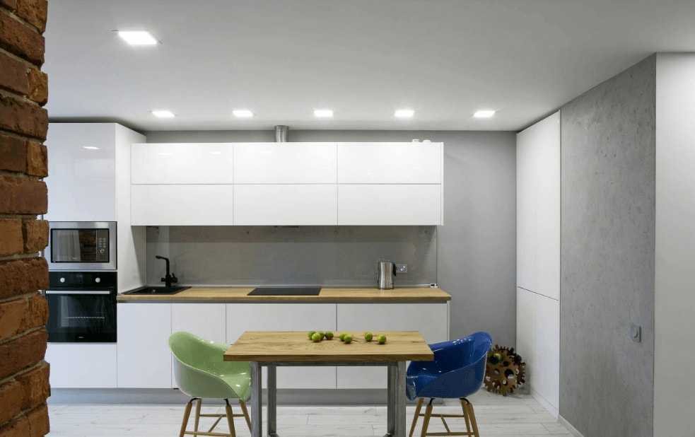 Недостаток света визуально сужает пространство, что для небольшого помещения недопустимо. Поэтому, как минимум, следует продумать центральное освещение, а также рабочей и обеденной зон.