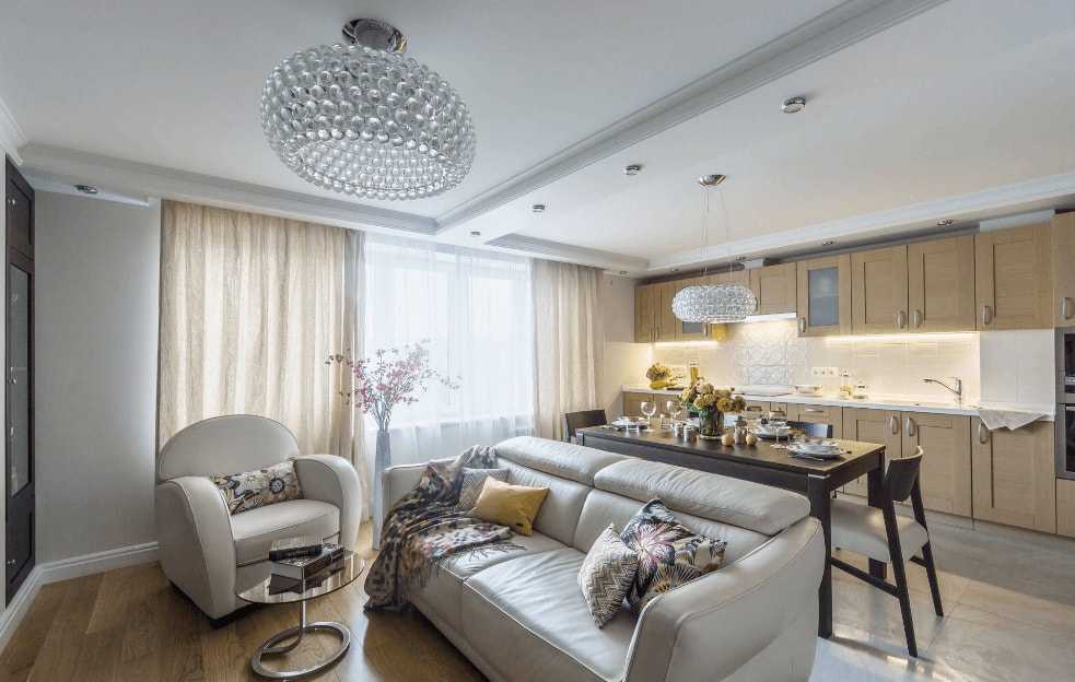 Здесь вы не увидите массивных люстр, загромождающих пространство. Их заменили встроенные точечные светильники по всему периметру потолка. Последним штрихом дизайн-проекта стала кремово-золотистая цветовая гамма, зрительно усиливающая эффект расширения площади помещения.