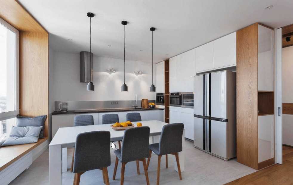 Выбору холодильника также стоит уделить максимум внимания. Он должен быть вместительным, иметь большую морозильную и холодильную камеру. Если он не подходит под дизайн кухни, специалисты рекомендуют запрятать его в нишу или сделать специальный шкафчик для его размещения.