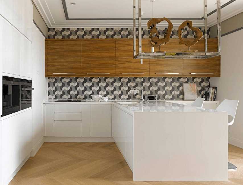 Очень красиво на кухне смотрится сочетание белого цвета с деревянной фактурой. Многие относят его к классике, но тем не менее выглядит это более изысканно. К тому же, каждая хозяйка оценит практичность данного решения.