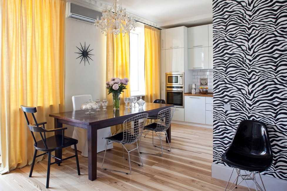 Чтобы разнообразить интерьер, вовсе не обязательно придумывать невероятно сложные конструкции или слишком необычный декор. На фото яркий пример того, как принт зебры на одной из стен и желтые шторы преображают помещение.