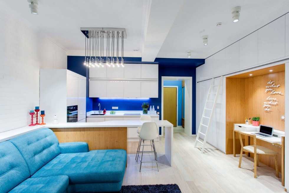 В декоре этой кухни-гостиной используются несколько оттенков синего цвета, который успокаивающе действует на каждого человека. Они применяются на части стены, диване и ковре. Таким образом общий дизайн помещения не перегружен деталями и в то же время выглядит интересно и не скучно.