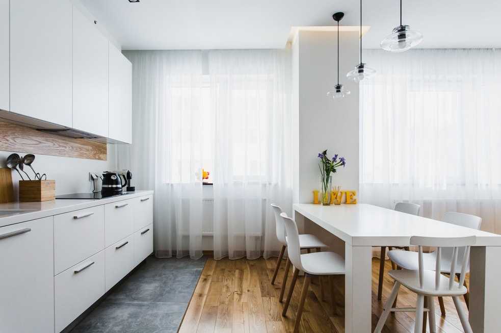 Интересный вариант декора кухни-гостиной получился за счет сочетания разных фактур. Кухня, стол, стулья и стены выполнены в стиле минимализм в белом цвете, а наличие дерева в интерьере добавило некой строгости. В то же время за счет легких, воздушных штор, общий дизайн кухни-гостиной выглядит очень уютно и стильно.