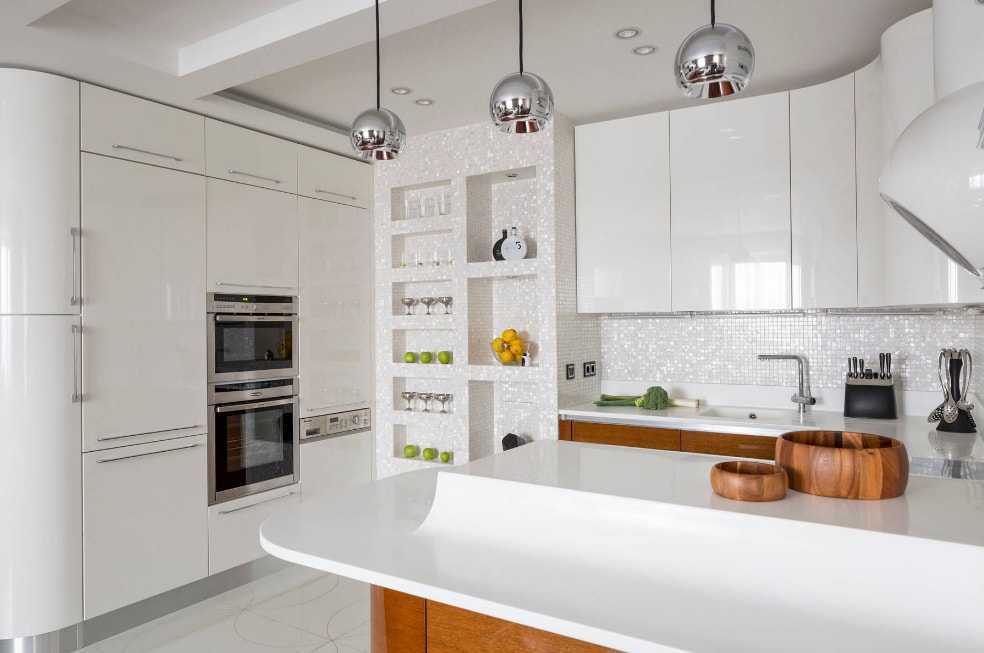 Для кухни средних и больших размеров подойдет П-образная кухонная меблировка, а также остров или полуостров. Здесь для зонирования идеально подойдет барная стойка и прямой диван.