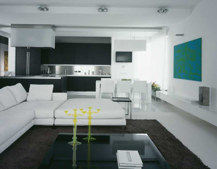 В оформлении совмещенной кухни-гостиной довольно большую роль играет цветовая гамма. Безусловно наиболее часто люди останавливают свою выбор на классических, холодных оттенках. Это черный, коричневый, серый или же белый цвет. Они идеально подходят для совмещенной кухни-гостиной, делают ее еще более просторной и светлой.