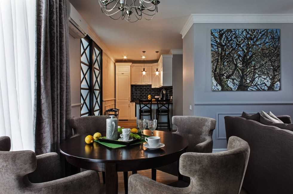 При выборе следует ориентироваться на стилевое оформление двух зон. Малогабаритную кухню-гостиную будет уместно обустроить компактной мебелью в светлых тонах или прозрачной конструкцией. В интерьер гармонично впишется круглый обеденный стол, который благодаря своей форме выглядит более легко.