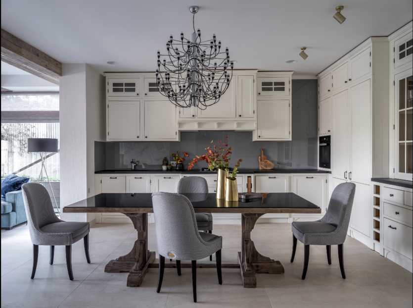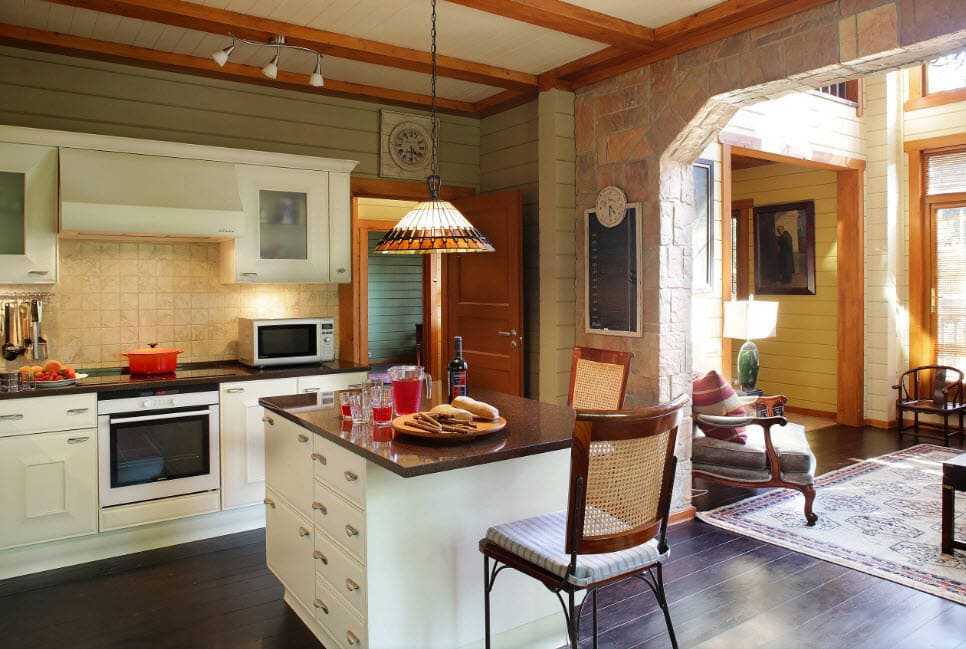 Кухня-гостиная не обязательно должна соответствовать стилю, что использовался для оформления загородного дома, но и не должна ему противоречить. Лучше всего сочетать классические направления между собой, так как и современные между собой. Также на то, каким будет будущий стиль, может повлиять изначальная отделка кухни, вполне возможно, что менять придется не так уж и много.