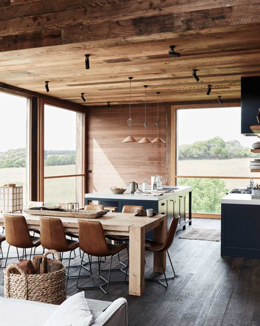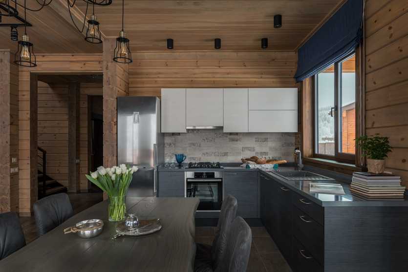 Но и среди владельцев городских квартир находятся желающие превратить свою кухню-столовую в такое уютное пространство, атмосферность которого передаётся даже через фото. Не захочется покидать получившуюся комнату тем, кто ценит интерьер с изрядной долей экологичности, преимущества натуральных материалов, общее визуальное спокойствие: