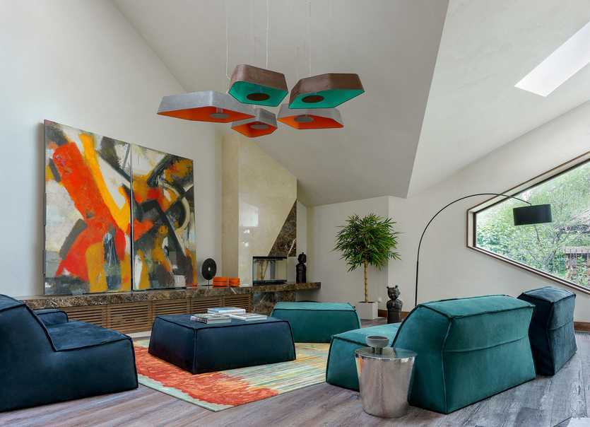 Бирюзовые и оранжевые акценты в интерьере кухни-гостиной в загородном доме