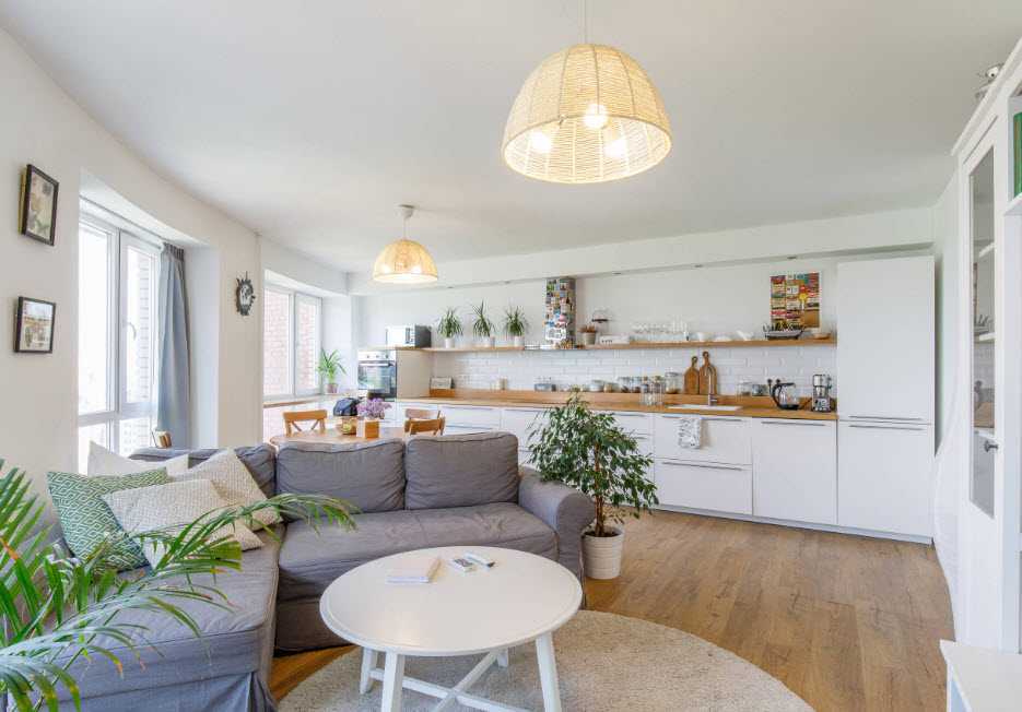 Если зона кухни наиболее важна и предназначена для всеобщих посиделок за одним столом членов семьи, друзей и родственников, тогда ей лучше отвести чуть больше половины помещения.