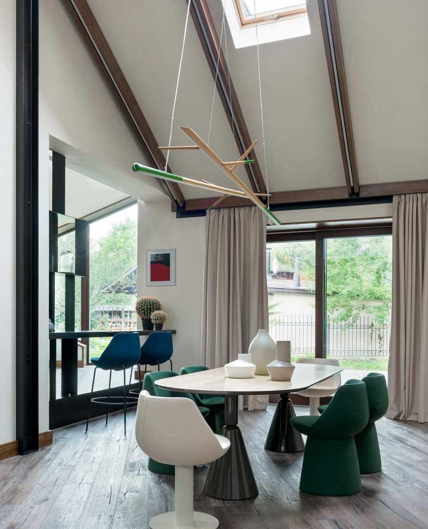 Для просторного помещения 1-го этажа в этом частном доме наши дизайнеры разработали стильный и современный интерьер гостиной, совмещенной с кухней. Яркие бирюзовые и оранжевые кресла не только создали жизнерадостную атмосферу, но и визуально отделили столовую зону от кухонной.