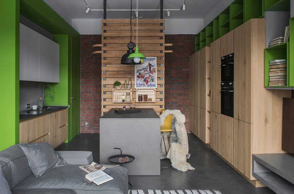 Такой вариант разделения подразумевает сразу несколько вариантов. Можно соорудить барную стойку. Многие кухонные гарнитуры включают отдельностоящий остров, который также может размежевать площадь. В качестве еще одного варианта дизайнеры предлагают возвести декоративную перегородку из гипсокартона с нишами или полками для размещения предметов декора, книг и других мелочей. Не стоит забывать и про диван в гостиной, который также может отделять ее от кухни.