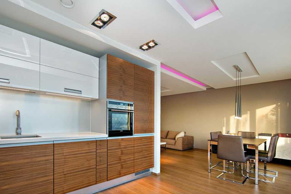 При помощи подвесного потолка с разными уровнями также можно визуально отделять одну зону от другой. Например, на кухне создается потолок более низкий, чем в гостиной. При этом для освещения рабочей зоны могут использоваться софиты, а обеденной – подвесные светильники. Какую именно часть потолка делать ниже, прежде всего, зависит от высоты помещения и того, насколько потолок ровный.