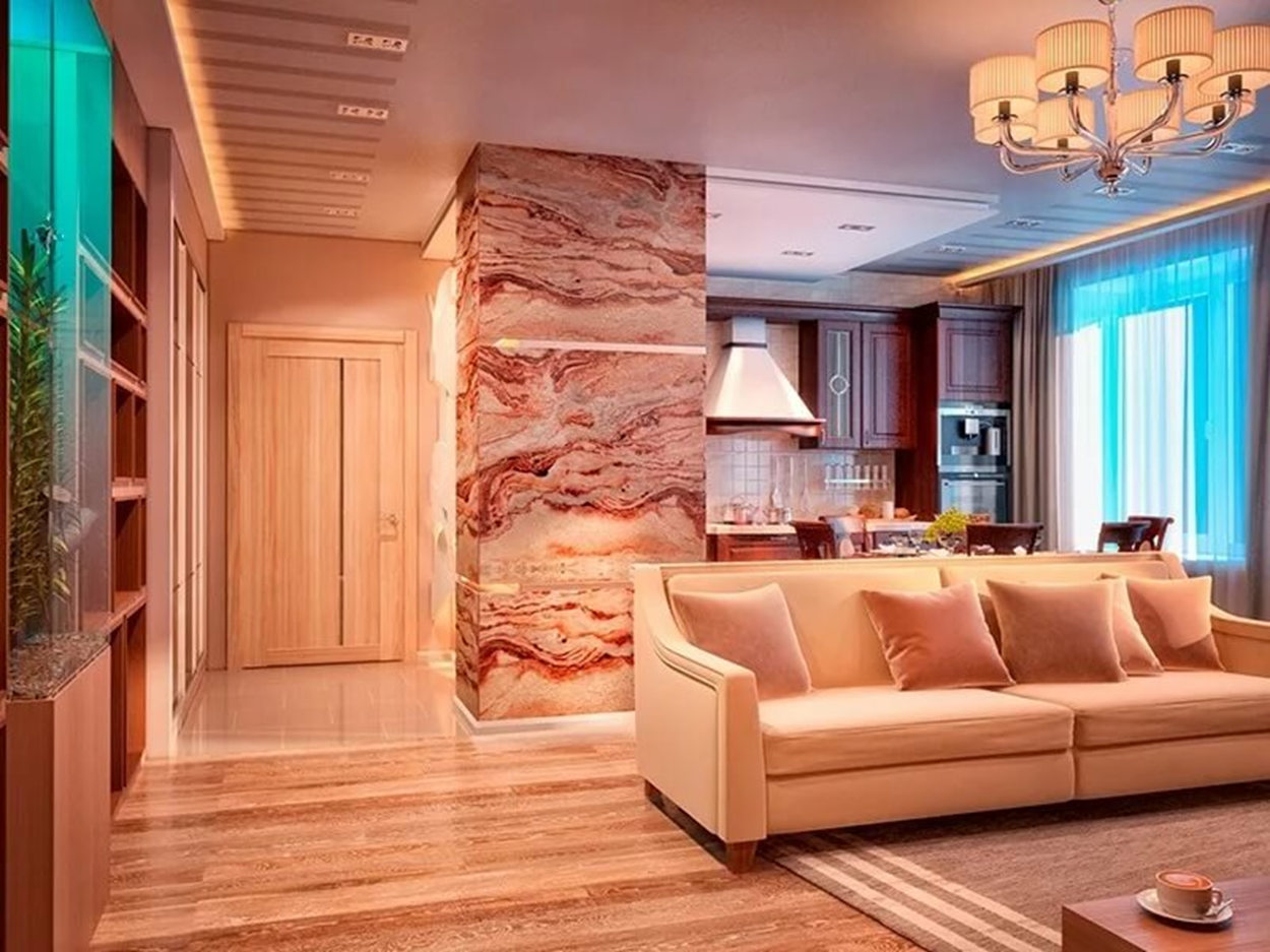 - декоративная штукатурка в кухне и декоративные панели на стенах гостиной.