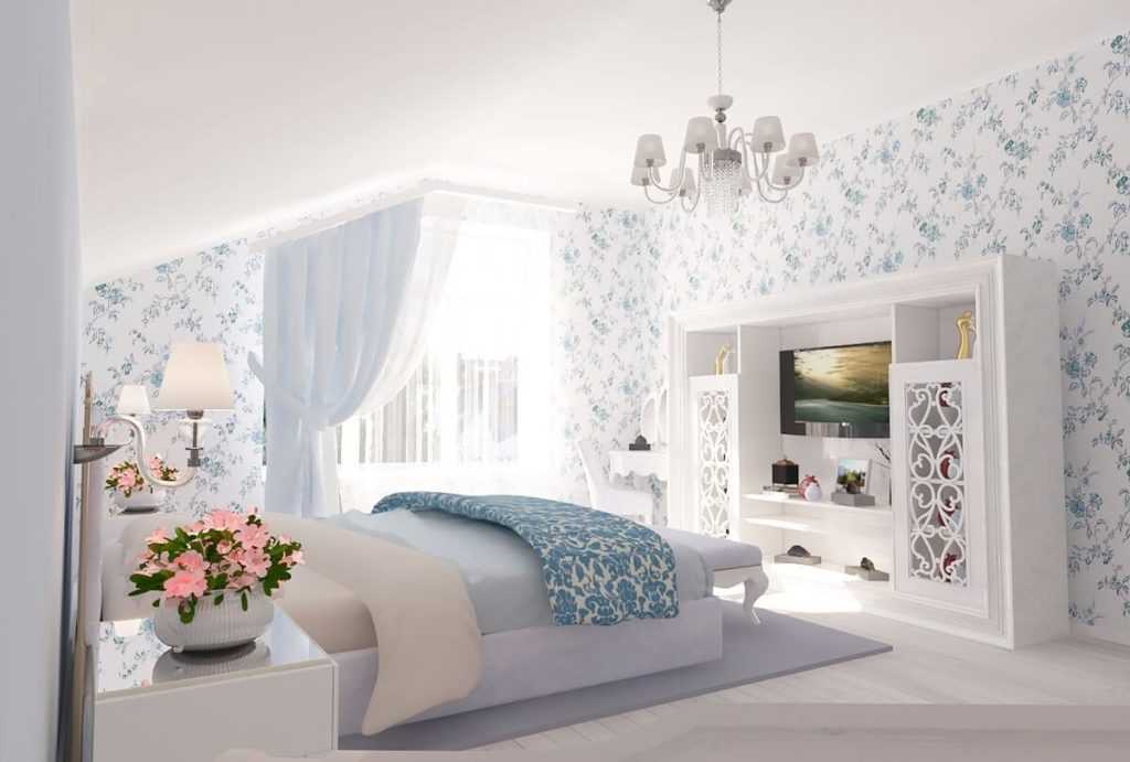 Женская спальня должна выглядеть более нежной и светлой. Наклейте в такой комнате обои с флористическими композициями или любым другим принтом небольшого размера.