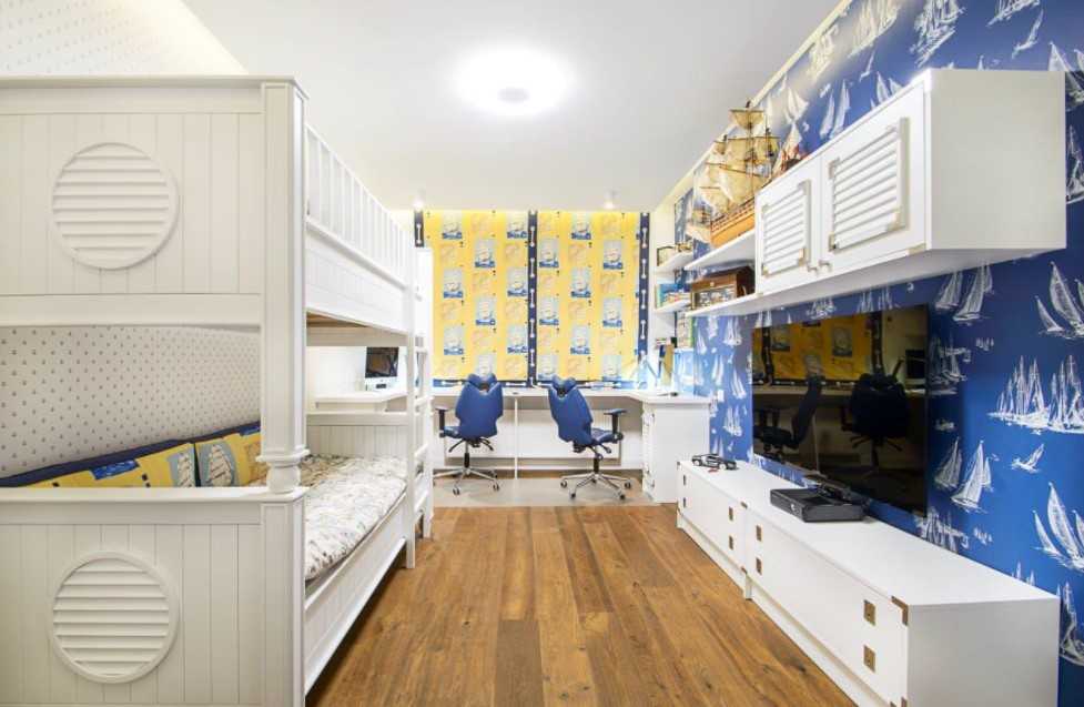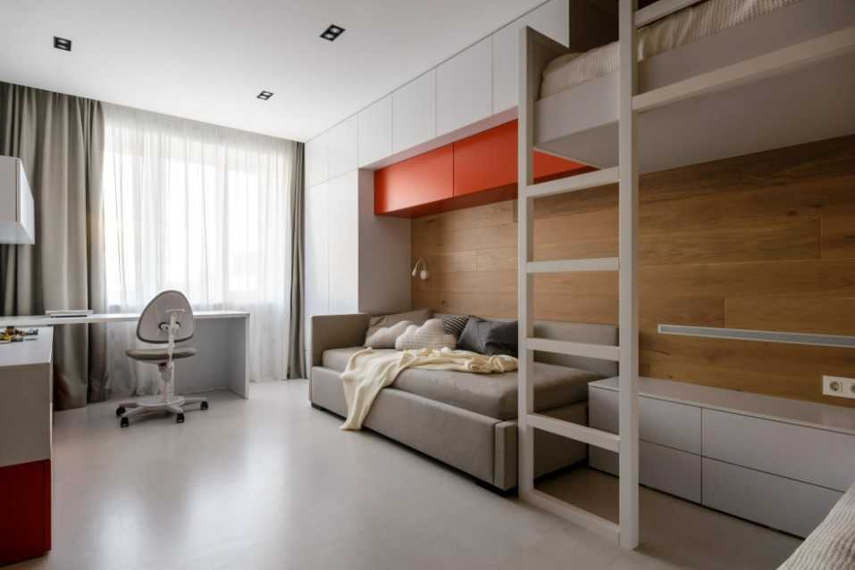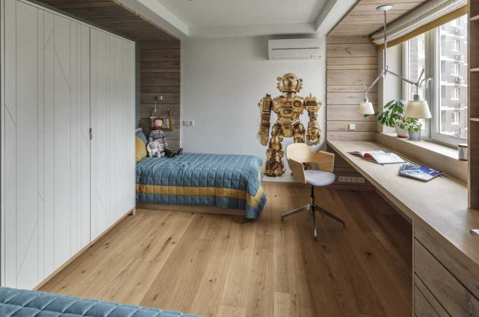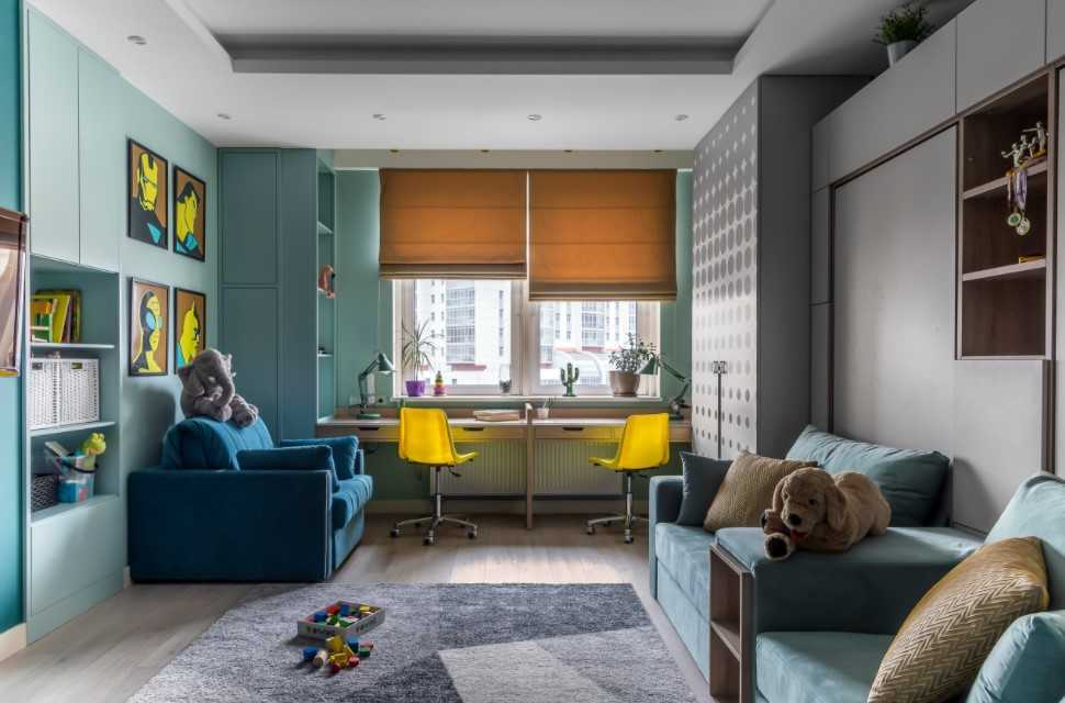 Прекрасный тандем для детской мальчика — интерьер в бежевой палитре получится не слишком мягким, но и не ледяным. Часто используется в гостиных, столовых, кухнях — сочетание освежающее, спокойное, умиротворяющее.