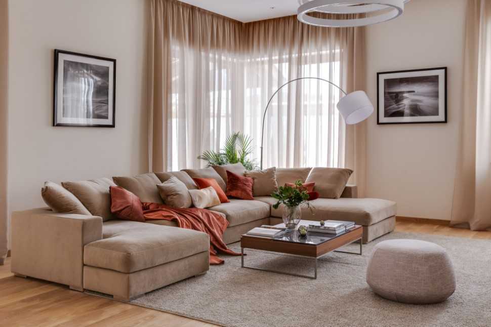 - Если бежевая мебель будет окружена темными или яркими оттенками, нужно ее как-то уравновесить. Делайте ставку на текстиль: светлые шторы или коврик мягко оттенят гарнитур и дополнят его.