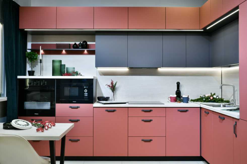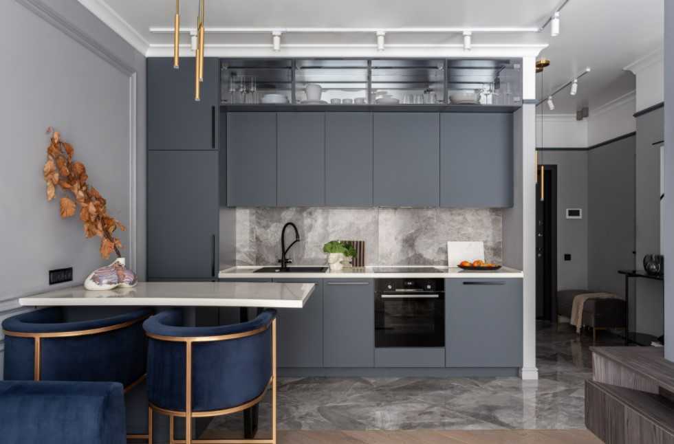 сыграть на контрасте со светло-серыми фасадами может черная техника. Например, глянцевый холодильник будет очень эффектно выделяться на светло-сером фоне;
