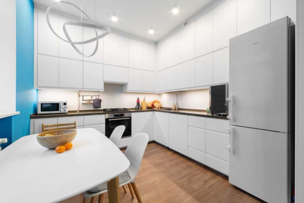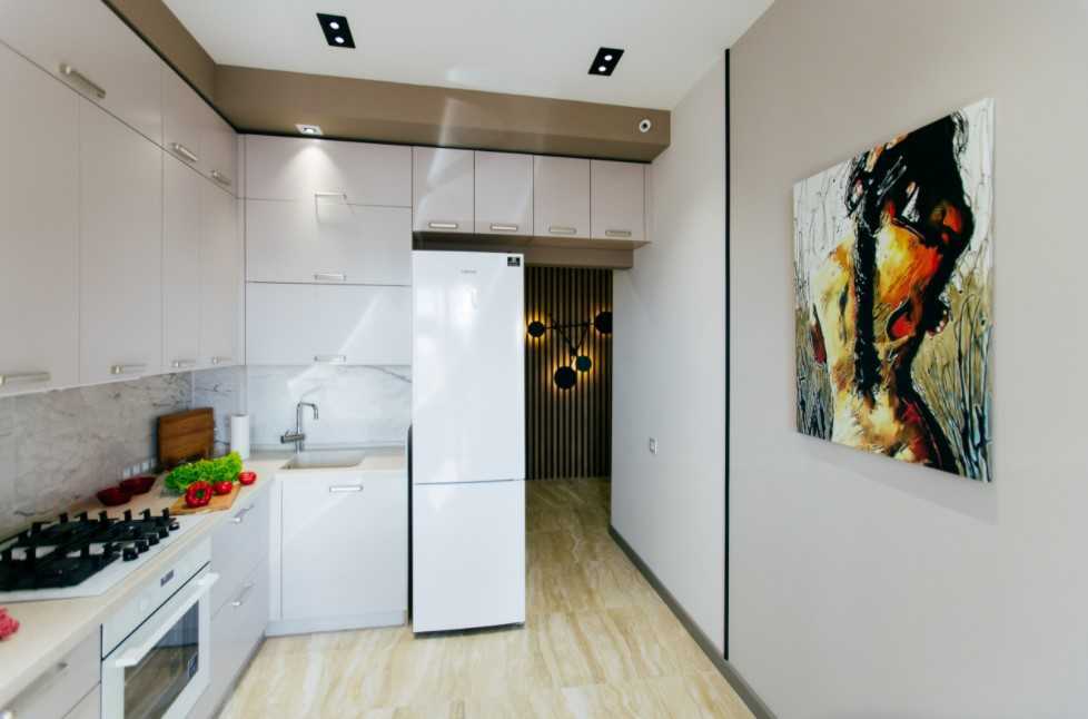 белая техника будет хорошо смотреться со светло-серыми фасадами в маленькой кухне, так как визуально легче смотрится в интерьере;