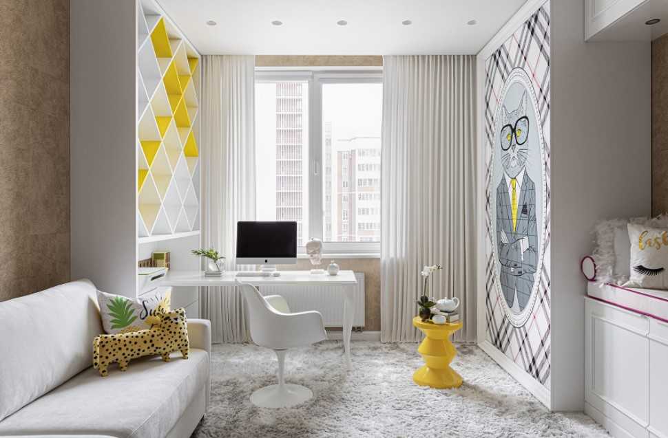 - Визуальное изменение пространства, возможность создания красивых комбинаций. Цвет в его светлых оттенках помогает сделать комнату более высокой, широкой.