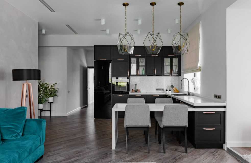 Обеденный стол выбирают, как правило, в светлых тонах или под дерево. Черное подстолье со светлой или деревянной столешницей тоже будет удачным решением для серой кухни.
