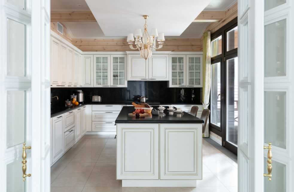 На бежевой кухне отлично смотрятся плафоны с позолотой — это не только осветительный прибор, но и просто классный декор, непосредственно участвующий в организации интерьера.